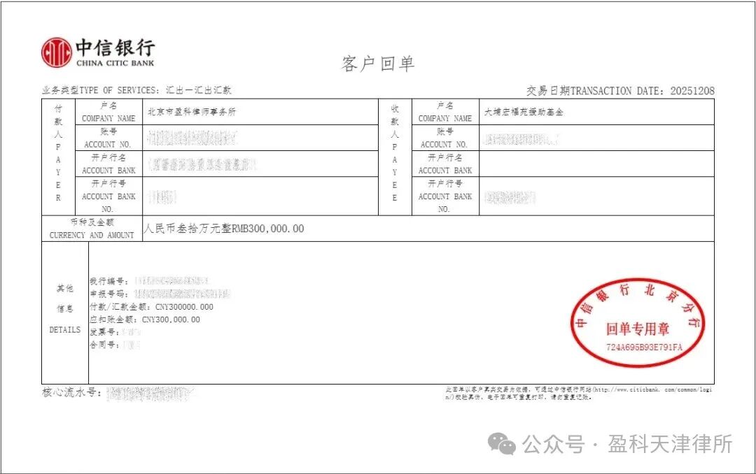2025年11月26日下午,香港新界大埔屋邨宏福苑多栋住宅楼发生严重火灾,造成重大人员伤亡。火灾事故发生后,社会各界迅速展开救援资助行动,以多种形式支持受灾居民的紧急安置、生活保障和灾后重建工作。危难之际,更显担当。盈科律师事务所第一时间向全体盈科同仁发出爱心募捐倡议,呼吁大家伸出援手,共担社会责任。倡议得到积极响应,全所上下迅速行动,汇聚点滴善心,并于12月8日向大埔宏福苑援助基金捐赠善款30万元人民币,专项用于支援受灾同胞生活安置与家园重建,以实际行动奉献爱心,与香港同胞守望相助、共克时艰。 捐款信息