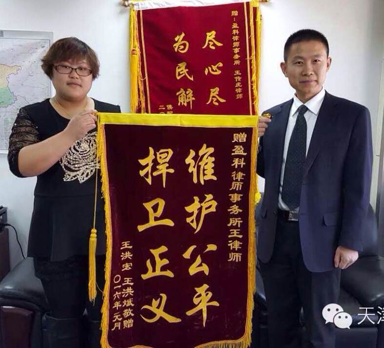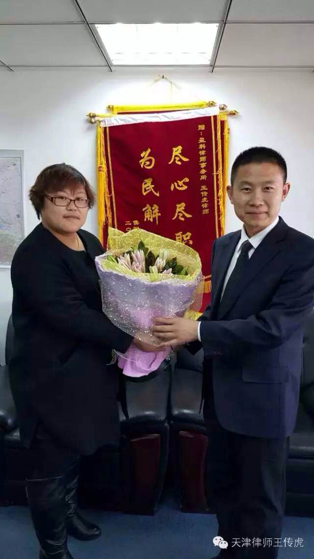 该案前后历经两年的时间,十多个繁琐的法律程序,原本五万就可以和解的纠纷,经王律师辛苦钻研,奔波劳碌,让委托人拿到五十多万。如今委托人对此结果非常满意,并在2016年2月25日专程来到天津律云律师事务所,将印有“维护公平,捍卫正义”的锦旗和馨香馥郁的百合送到王律师手中,并承诺以后有什么法律事务都全部委托给王律师。这既是2016年王律师荣获的第一面锦旗,也是王律师执业生涯中第一次收到鲜花,不仅突出肯定了王律师的工作业绩,也同时为今年的法律服务开启了美好的开端。