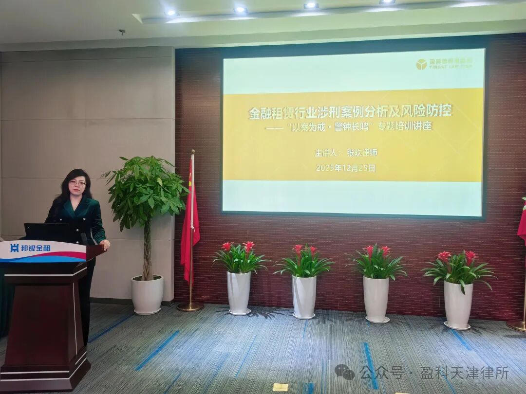 2025年12月25日,北京盈科(天津)律师事务所青少年维权中心主任、学术工作委员会副主任张欢律师受邀为邦银金融租赁股份有限公司开展题为“金融租赁行业涉刑案例分析及风险防控——‘以案为戒·警钟长鸣’”的专题培训讲座。本次讲座线上线下共计90余人参与,现场气氛热烈,反响积极。